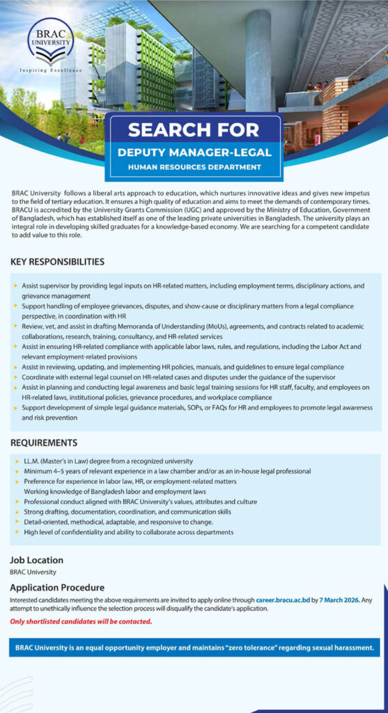 BRAC University is currently seeking a competent and experienced legal professional for the position of Deputy Manager – Legal under the Human Resources Department.